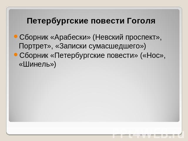 В 1835 году в Петербурге вышел сборник рассказов «Арабески», где была опубликована повесть Гоголя «Клочья записок сумасшедшего». Позже Гоголь изменил название произведения и включил его в «Петербургские повести».