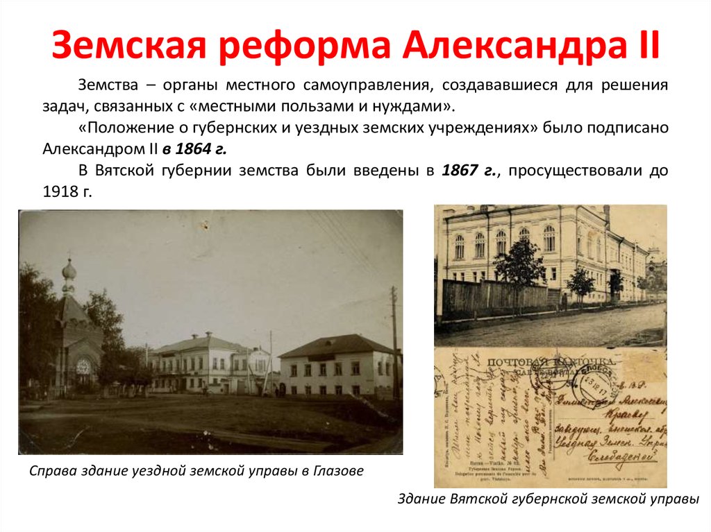 «Положение о губернских и уездных земских учреждениях» 1864 года создавало новые управленческие органы: земские собрание и земские управы, в которые входило местное население (выбор не зависел от сословия).