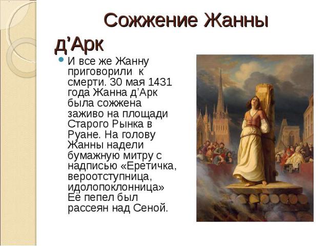 На кладбище аббатства Сент-Уэн Жанна подписала бумагу о виновности и связи с дьяволом. Судьи вырвали признание обманом, зачитав иной документ. Вскрылся подлог позже, в процессе реабилитации мученицы. Приговор трибунала гласил: «Казнь через сожжение на костре заживо». Жанна до момента гибели держалась спокойно и уверенно. «Голоса» обещали Орлеанской деве спасение в мае 1431 года.