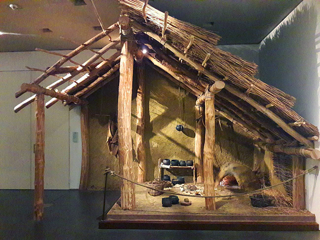 Внутреннее помещение длинного дома было как местом работы, так и служило укрытием для семьи и ее животных. Вокруг очага этого реконструированного жилища стоят корзины, сплетенные из тростника, и расстелены на полу шкуры. По стенам складированы орудия труда.