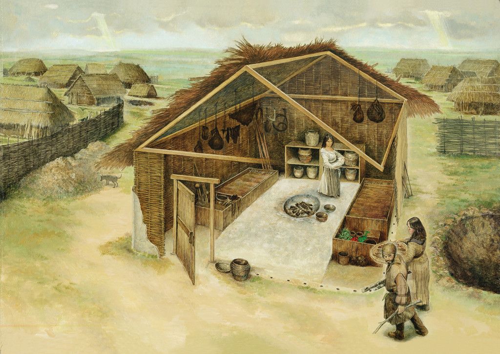 Последняя часть каменного века названа неолитом — или новым каменным веком. В это время люди научились делать постоянные дома из камня, обкладывали их дёрном, укрепляли деревом. Несколько жилищ соединяли крытыми переходами. Жилище становилось постоянным, поскольку племена от охоты переходили к земледелию и скотоводству. Это значит, что люди уже не кочевали за стадами животных, а начинали их приручать и пасли рядом с домом.