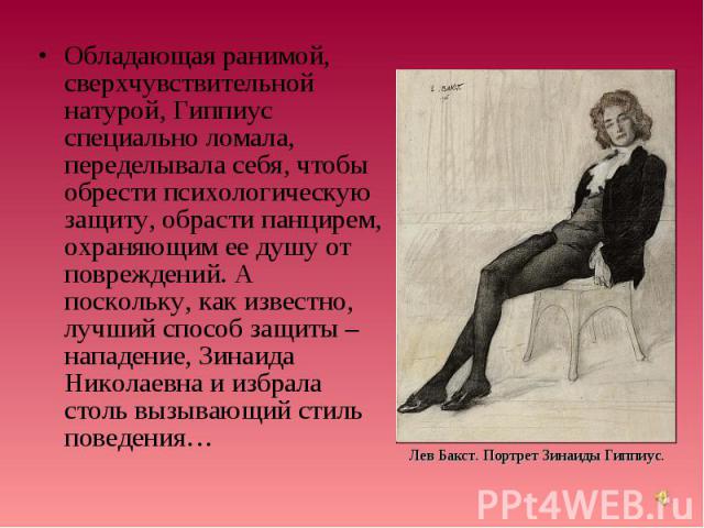 - Известный художник Леон Бакст решил как-то написать портрет Гиппиус. Он хотел передать истинную красоту женщины, особенно ее прекрасные длинные ноги. Для этого художник подклеил к портрету дополнительный лист бумаги.