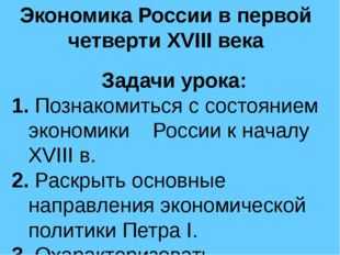 Описание слайда:Экономика России в первой четверти XVIII века Задачи урока: 1. Познакомиться с состоянием экономики России к началу XVIII в. 2. Раскрыть основные направления экономической политики Петра I. 3. Охарактеризовать экономические преобразования и их итоги в первой четверти XVIII в.