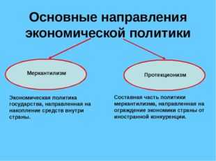Описание слайда:Основные направления экономической политики Меркантилизм Протекционизм Экономическая политика государства, направленная на накопление средств внутри страны. Составная часть политики меркантилизма, направленная на ограждение экономики страны от иностранной конкуренции.