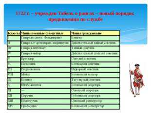 Описание слайда:1722 г. – учрежден Табель о рангах – новый порядок продвижения по службе