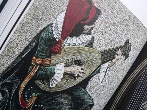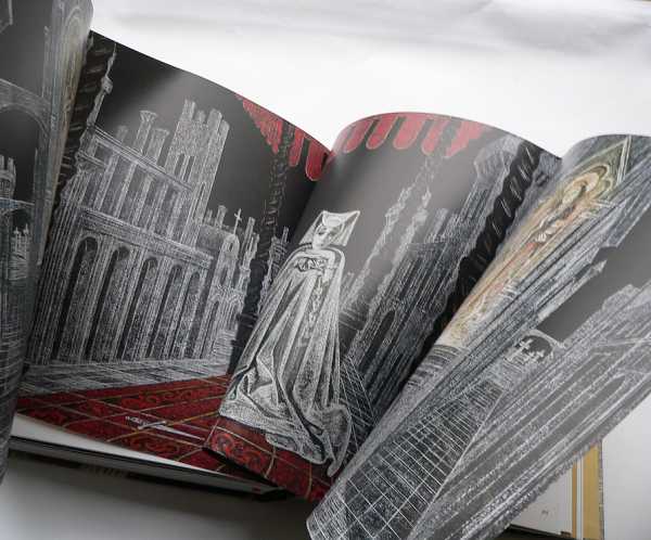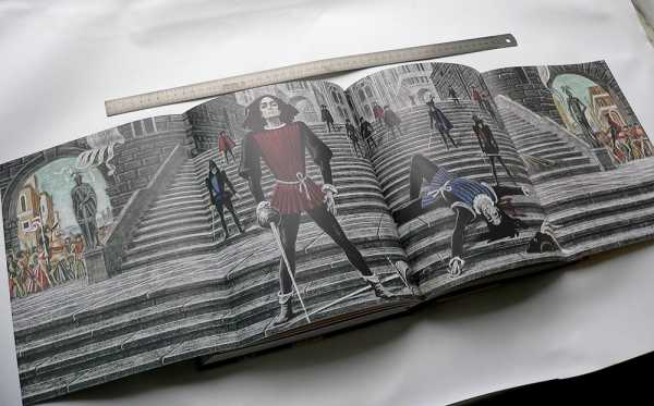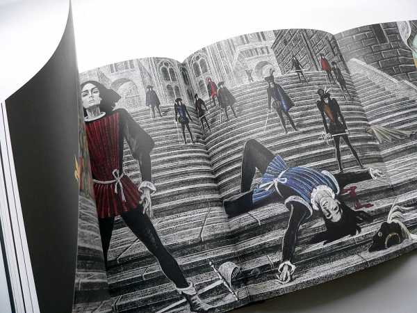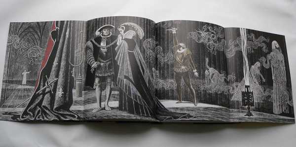 И я смотрю, как дочь любовно гладит рельефные линии на обложке, бережно переворачивает листы и надолго застывает над иллюстрацией, а потом незаметно переходит к чтению какого-нибудь отрывка, и понимаю, что мои ожидания полностью оправдались. Все в этой книге прекрасно, от приятной матовой мелованной бумаги, ляссе и шрифта до шикарных иллюстраций, распахивающихся вам навстречу, раскрывающихся, как двери театра. Они приглашают не в книгу, нет, на спектакль, это не застывшее монументальное изображение, но живое действо. Непостоянная Верона и мрачный Эльсинор ждут вас, музыка балов и холод склепа, звон клинков и горечь ядов, любовь и смерть.