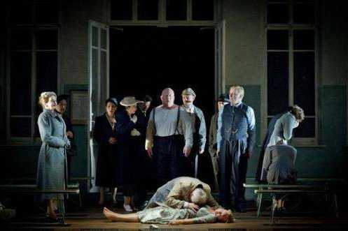 Тихон хочет бежать за Кулигиным, но Кабаниха, угрожая проклятьем, не пускает его. Люди приносят мертвую Катерину: она бросилась с берега и разбилась.