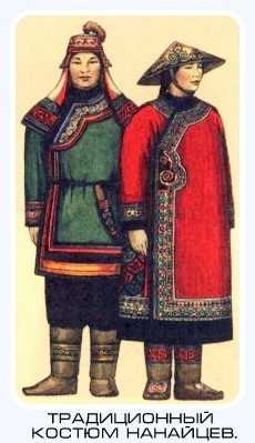 Традиционный костюм нанайцев — халат с запахивающейся направо полой, узкие и короткие штаны и ноговицы (деталь одежды типа гетр). Женщины под халат надевали нагрудник с металлическими подвесками. Зимнюю обувь (её носили поверх меховых или кожаных чулок) делали из рыбьей кожи, а летнюю — из кабаньей. В холода носили меховые шапки с наушниками, а в тёплое время года — берестяные шляпы. Женские головные уборы, особенно зимние, отличались от мужских: надевали или стёганую шапку на вате наподобие шлема и с шишечкой на макушке, или фетровые шапки в форме колпака с отогнутыми вверх краями.