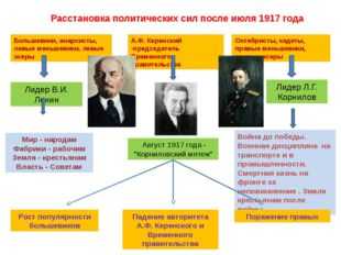 Описание слайда:Расстановка политических сил после июля 1917 года Большевики, анархисты, левые меньшевики, левые эсеры А.Ф. Керенский -председатель Временного правительства Октябристы, кадеты, правые меньшевики, правые эсеры Лидер В.И. Ленин Лидер Л.Г. Корнилов Мир — народам Фабрики — рабочим Земля — крестьянам Власть — Советам Война до победы. Военная дисциплина на транспорте и в промышленности. Смертная казнь на фронте за неповиновение . Земля крестьянам после войны Август 1917 года — «Корниловский мятеж» Рост популярности большевиков Падение авторитета А.Ф. Керенского и Временного правительства Поражение правых