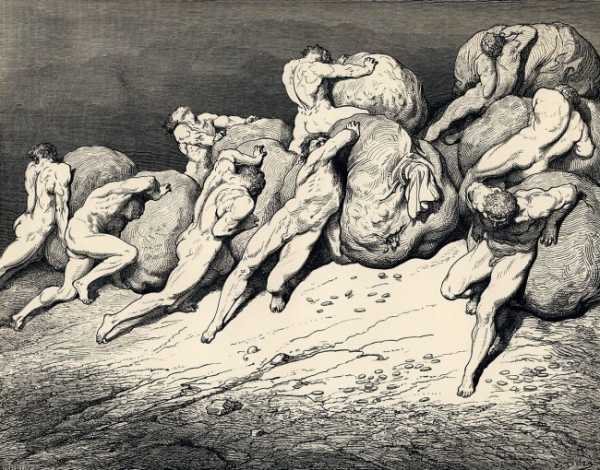Обитель тех, кто «недостойно тратил и копил», гигантская равнина, на которой стоят две толпы. Толкая грудью грузы, они идут навстречу друг другу, сталкиваются и затем расходятся, чтобы начать все сначала. На страже стоит Плутос. Наказание: вечный спор.
