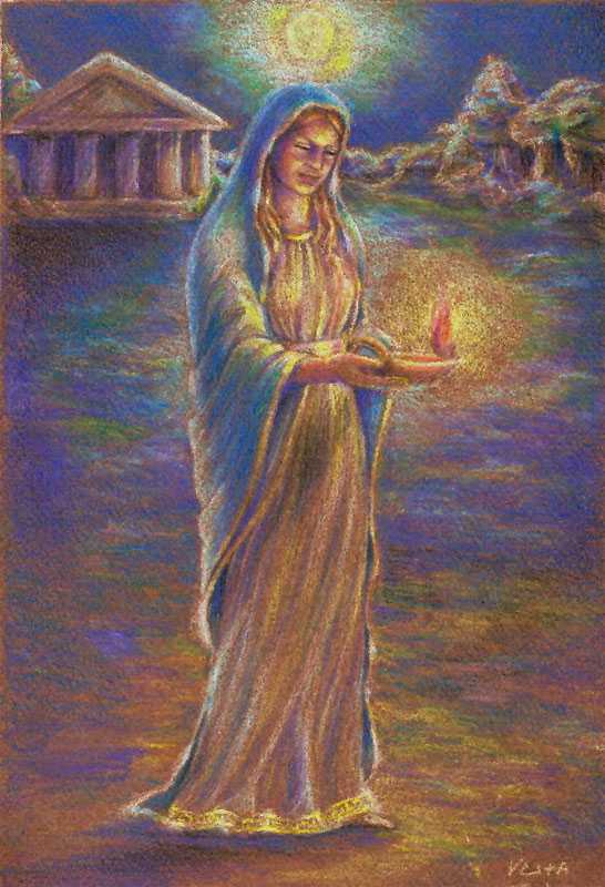 Гестия — богиня не только домашнего очага, но и храмового священного огня. Ее архетип представляется и в образе служительницы божества, жрицы, посвятившей себя высшему смыслу, далекому от человеческих забот и суеты. Это другой полюс архетипа Гестии. Вот она, анонимная и неузнанная под своим покрывалом, скрывающим тайну. [2]